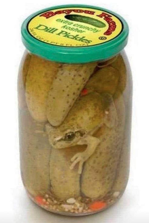 Could one call this “uncanny canning”? Or is it an amphibious pickle? Did the frog take the place of a shirkin’ gherkin, perhaps? Either way, it’s des-pickle-able . . .