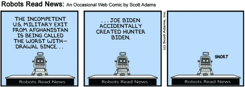 Cartoonist Scott Adams, best known for his long-running Dilbert comic strip, also puts out an occasional series that he calls “Robots Read News”. It’s snarkier and sometimes nearer the bone than Dilbert.