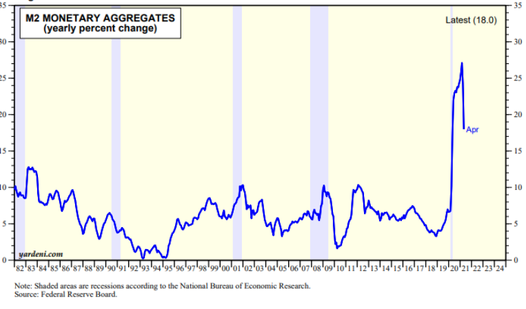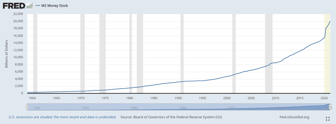 They haven’t taken a look at that half-full glass of water, and its possible implications. To look at just the current state of the glass is one thing. To look at how it got that way – how quickly it was half-filled (or half-emptied), and why – is entirely another, and might change our perspective on it. What happens if we look at inflation the same way? We’ve already seen that it’s essentially a monetary supply problem. The more money there is in circulation, chasing approximately the same number of assets or needs, the more expensive those assets and needs will get; or, in other words, the less each individual unit of money in circulation will be worth.