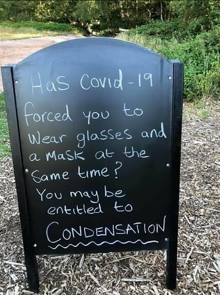 Yes, I do have condensation on my glasses when I have my mask on. It makes me sooooooooooo MADDDDD. Which is why I walk slowly, with my arms out ahead of me, and SQUINT. Where can I get a black cane?