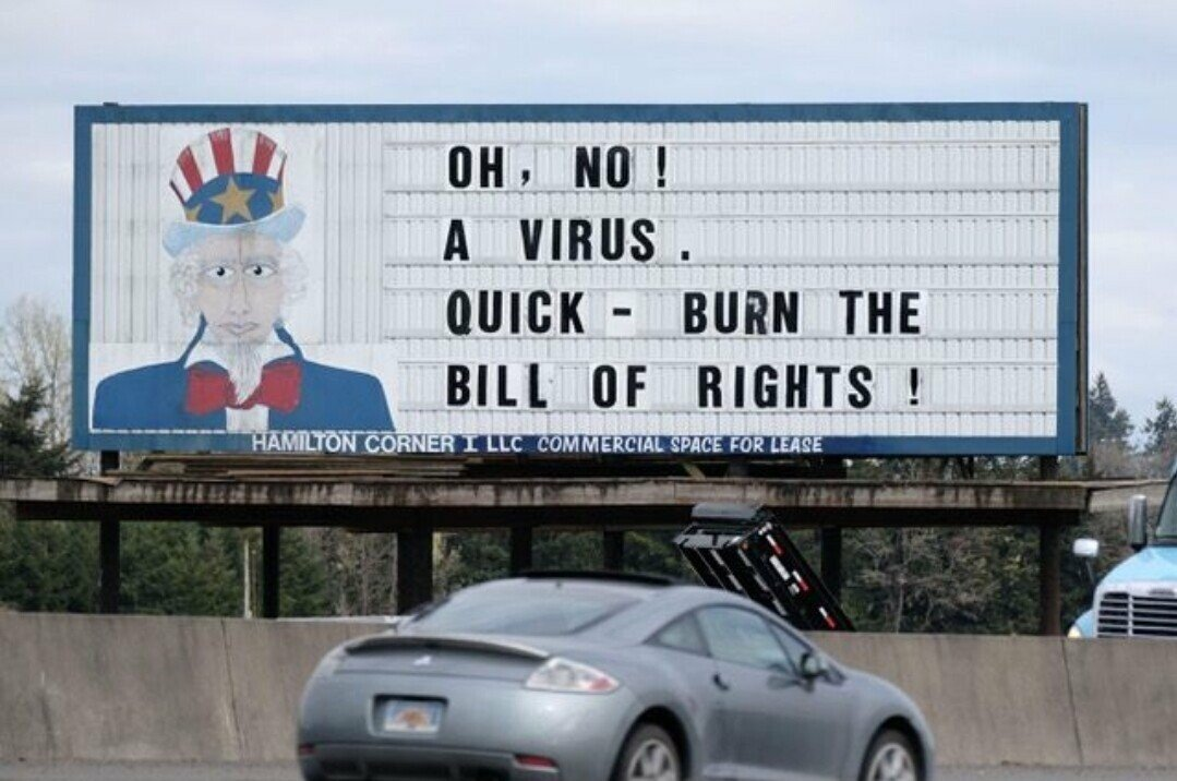 The Billboard, "Oh No, A Virus" with a Man wearing Red, White, and Blue next to that, looks a lot like those a guy up in Washington State puts up along I-5 North.