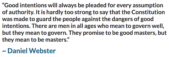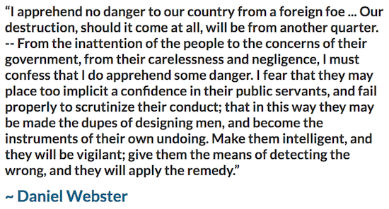 If Mr. Greenwald’s words sound familiar, it’s because we’ve been warned about that sort of thing by wise men for many years. Take Daniel Webster in the 19th century.