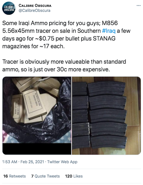 So standard 5.56mm ball is just $0.55 a round in a street bazaar in Iraq! Don’t bother sending care packages to your buddies stationed over there. Ask them to send you ammo packages instead!