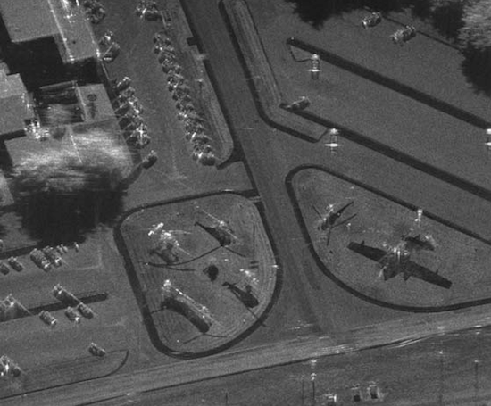 Another example from New Mexico shows parked vehicles and aircraft on static display at Kirtland Air Force Base (again, cropped and reduced in size). The source comments: “Note that the aircraft are better defined by their shadows than by their direct echo return.”