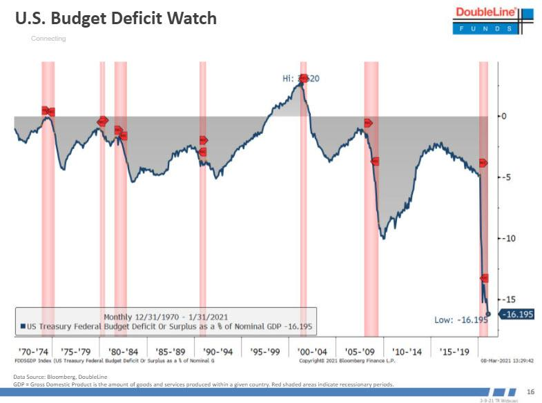Gundlach also points out that the vast majority of the US budget is currently funded by borrowing (i.e. deficit spending). He says: “80% of the budget is borrowing, so why bother with taxes at all?” That’s not a bad question.